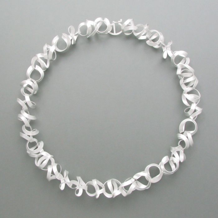 Diese edle Silberkette wirkt wie unregelmäßig in sich verschlungene Bänder, die an Bandnudeln erinnern. Der Übergang zwischen den Gliedern ist durch das „Gestrick“ nicht zu erkennen, wodurch die Kette wie ein fließendes, verwickeltes Band erscheint. Das matte Silber leuchtet sehr hell und verleiht der Kette so ein reines, strahlendes Äußeres. Die Silberkette ist vor allem bei feierlichen Anlässen ein angemessener Begleiter, kann aber auch im Alltag getragen werden. Sie ist die größere Variante unserer beliebten Silbercollier-Tagliatelle. Zu dieser Kette empfehlen wir aus dem Sortiment unseres Online-Shops für Silber- und Edelsteinschmuck das passende , die kleinen „gewickelt“ oder die etwas größeren „Knoten“. Armband Silberohrstecker Ohrstecker