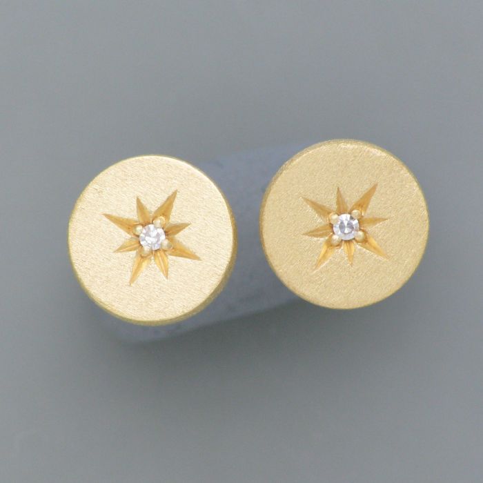 Diese bezaubernden Ohrstecker sind vollständig aus vergoldetem Silber gefertigt und bestehen aus zwei runden Plättchen. Die Oberfläche ist matt gehalten und in der Mitte der Plättchen ist jeweils ein kleiner Stern eingraviert in dessen Zentrum wiederum ein kleiner Brillant sitzt. Durch die Brillanten funkeln die Sterne fast wie richtige Sterne am Ohr und ziehen jeden Betrachter sofort in ihren Bann. Die Ohrstecker können durch eine passende Kette und ein Armband ergänzt werden.