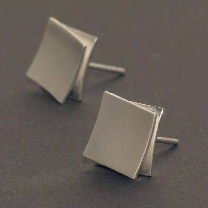 Diese Silberohrstecker wirken aufgrund des hellen Silbers und der eckigen Formen modern und sachlich. Trotzdem werden die Ohrstecker durch die sanfte Rundung der zwei Silberscheiben zu gefälligen und klassisch wirkenden Schmuckstücken.